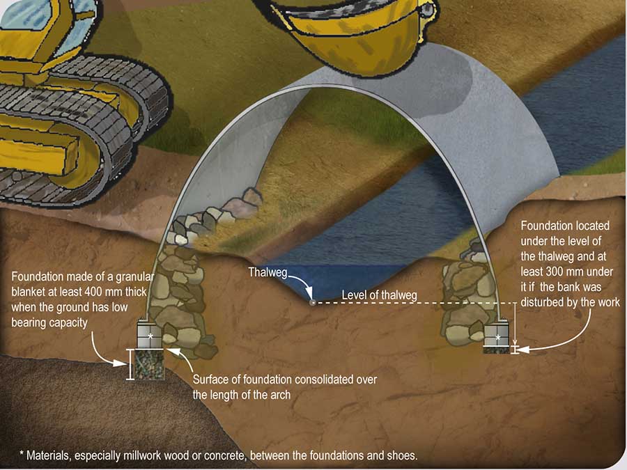 (7) the walls of a wooden culvert or the shoes of an arch other than wooden must be installed on level foundations consolidated over the whole length of the arch. The foundations must be below the thalweg. Where the banks are disturbed by the work, the foundations must be at least 300 mm under the thalweg. If rock is present before reaching that depth, the walls or shoes must be anchored to the rock. For ground with weak bearing capacity, the walls or shoes must be installed on foundations made of a granular blanket at least 400 mm thick;