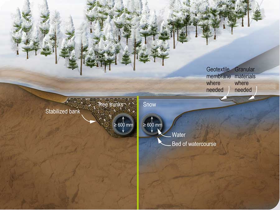 - a structure composed of 1 or more conduits at least 600 mm in diameter installed on the bed of a watercourse and whose fill is constituted of tree trunks or snow and covered if needed with a geotextile membrane and granular materials;