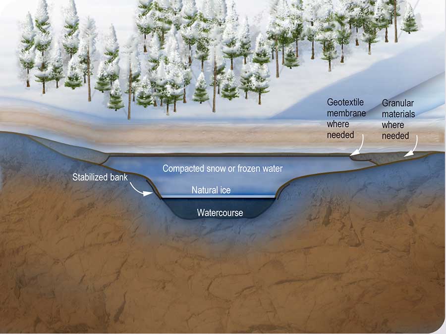 - a structure composed of compacted snow or frozen water, covered if needed by a geotextile membrane and granular materials, in particular where there is a risk of carrying sediments into the watercourse;