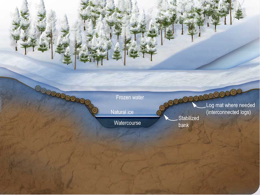 - an ice bridge, that is a structure composed only of frozen water and reinforced if needed by log mats that are interconnected.