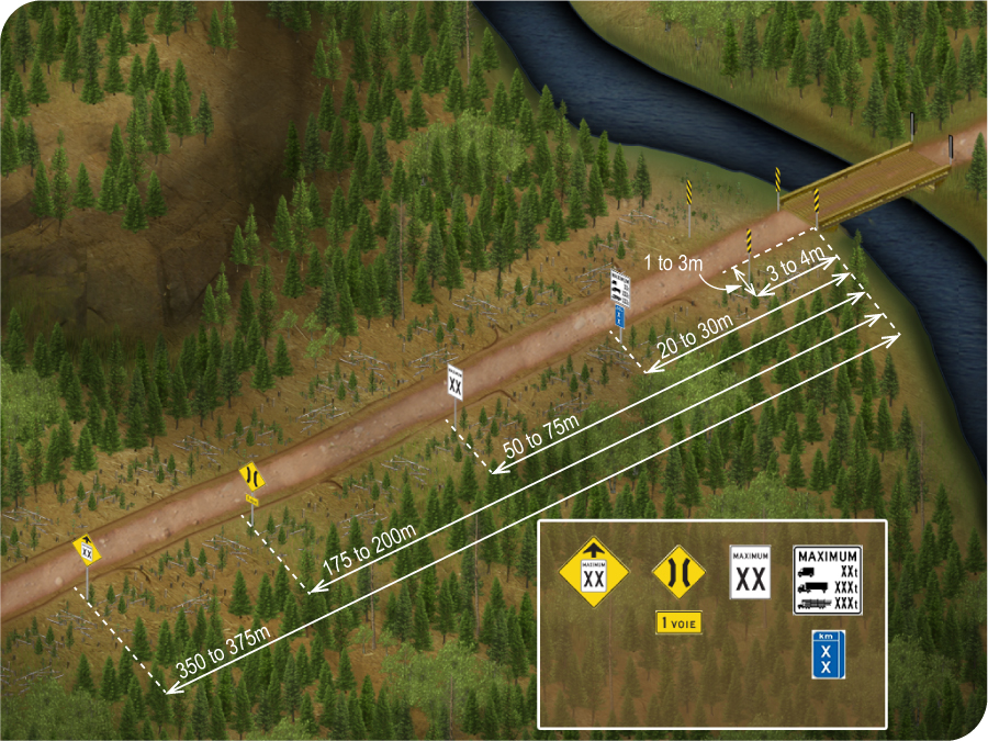 Every person authorized to build or improve a bridge must, at the end of the work, post at each end of the bridge the following elements: hazard markers signalling the limits of the bridge deck, the indication of a narrow crossing, the maximum load the bridge may support based on the types of vehicles and the speed allowed for crossing the bridge. The foregoing also applies to a person who repairs a bridge.![]()