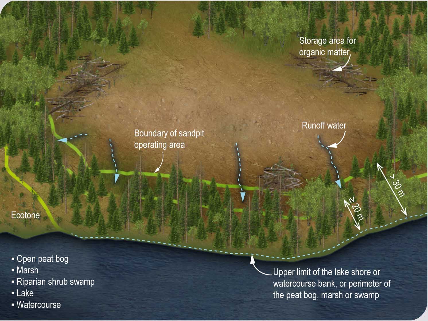 A sandpit operating area and the storage area for the organic matter that covered the sandpit must be at more than 30 m from an open peat bog, a swamp, a riparian shrub marsh, a lake or a watercourse.![]()
