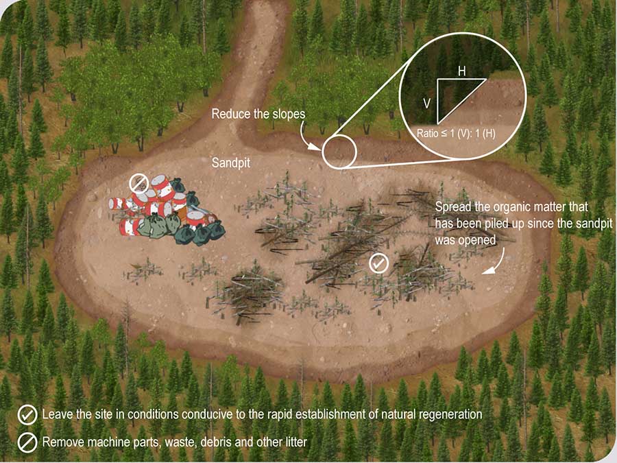 A person who uses a sandpit for the construction, improvement, repair, maintenance or decommissioning of forest roads must, within 30 days after the end of that use, restore the site to allow its integration into the environment and, for that purpose, clear the surface of the site of machine parts, waste, debris and other litter, reduce the slopes to a ratio of 1 (V) in 1 (H) or to a lesser ratio and respread the organic matter that has been piled up since its opening. The site must be left in conditions conducive to the rapid establishment of the natural regeneration. ![]()