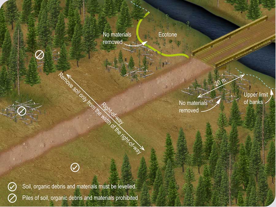 In the case of a road crossing a watercourse, no material may be removed in the riparian ecotone or over a width of 20 m measured from the upper limit of the watercourse bank.