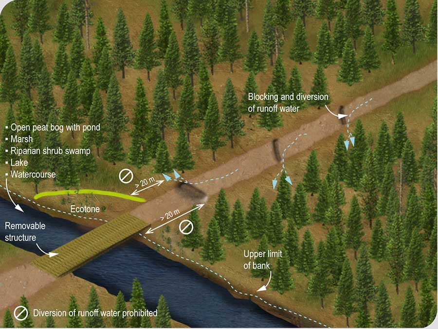 Runoff from the right-of-way of a winter road disturbed during the construction of the road must be blocked and diverted towards vegetation areas located more than 20 m from an open peat bog with a pond, a marsh, a riparian swamp, a lake or a watercourse. The 20-m distance is measured from the limit that separates the stand from the open peat bog with the pond, the marsh, the riparian swamp, the lake or the permanent watercourse or from the upper limit of the bank of the intermittent watercourse. In the presence of a riparian ecotone, the measurement is made from the limit of the ecotone farthest from the environment to be protected.