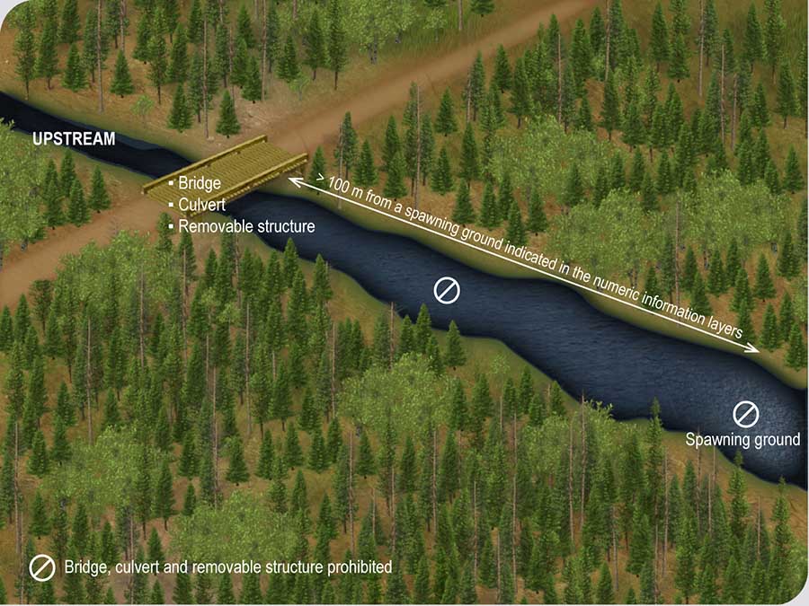 The construction of a bridge or culvert or the installation of a removable structure is prohibited in a spawning ground. Such work is also prohibited within the first 100 metres upstream from a spawning ground indicated in the numeric information layers used for forest planning. The purpose of this is to avoid the destruction or deterioration of spawning grounds as a result of work carried out in the watercourse bed.
