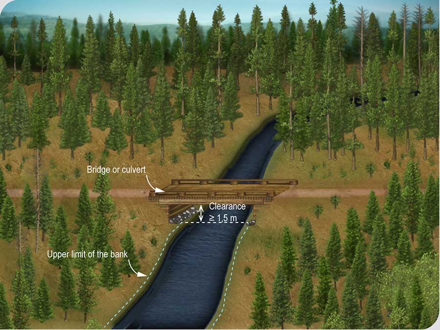 Every person authorized to build or improve a bridge or a culvert on the watercourse of a canoe-kayak-camping course and downriver canoeing course or boat access route to trapping grounds must ensure that the minimum clearance of the bridge or culvert is 1.5 m above the upper limit of the bank. The foregoing also applies to a person who repairs a bridge or a culvert on the watercourse of a canoe-kayak-camping course and downriver canoeing course or boat access route to trapping grounds.
