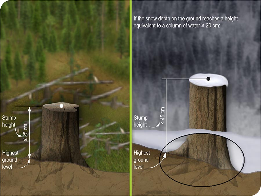 Where snow depth on the ground reaches a height equivalent to a column of water at least 20 cm high, the maximum height of the stumps must not exceed 45 cm. ![]()