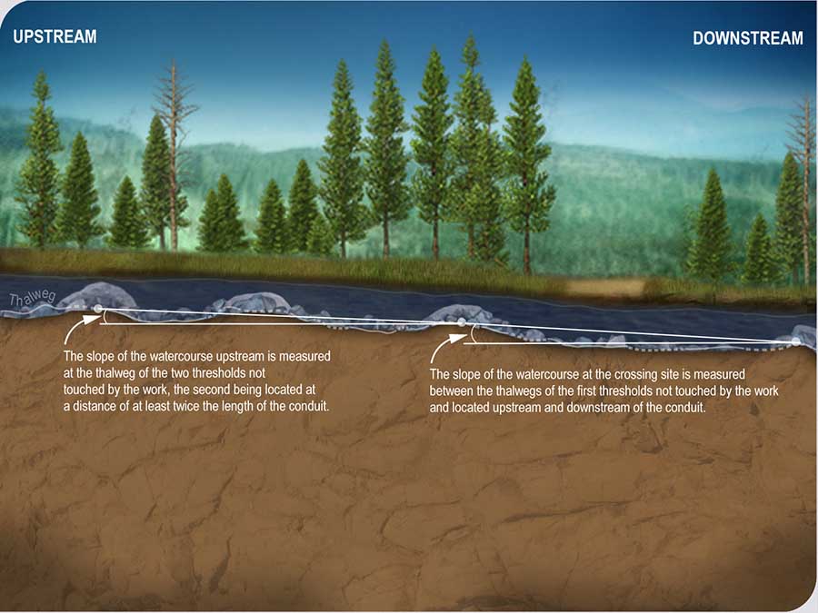 The slope of a watercourse is measured between two natural thresholds unaffected by the work (excavation, conduit installation, riprap, etc.). A threshold is an elevation of substrate across a watercourse that is not necessarily perpendicular to its axis and that is situated between the two deepest sections.