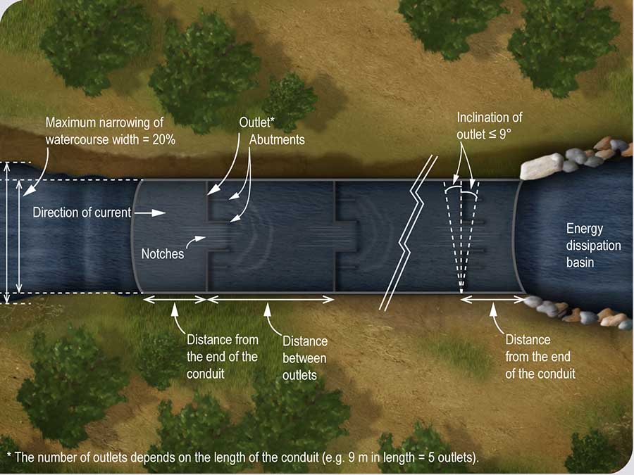If the conduit with no outlets is placed higher than the conduit with outlets, the water is concentrated in the conduit with outlets during low flow periods. This ensures an adequate water level in the conduit with outlets. The outlets create a series of thresholds and basins in the culvert to maintain a fast enough flow and sufficient depth of water to ensure the free flow of fish.