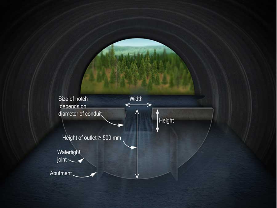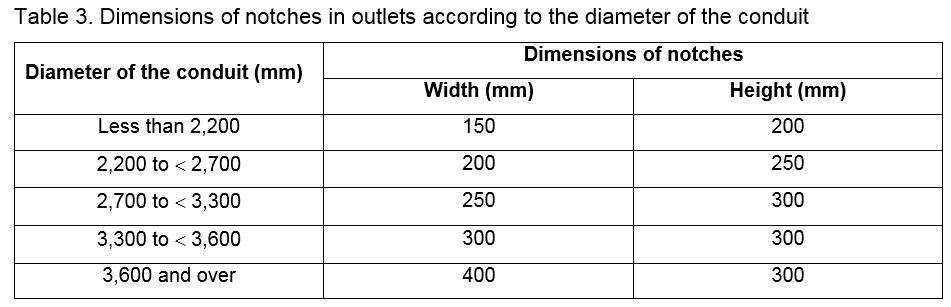 Notches in outlets must be rectangular with dull edges. Notches may be located in the centre of the outlets or off-centre alternating from one outlet to the other. The dimensions of the notches in the outlets must comply with the standards in table 3, which vary according to the diameter of the conduit.