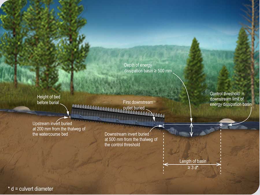 The downstream invert of the conduit must be buried at a depth of 500 mm in relation with the thalweg of the control sill not touched by the work. The control sill is located downstream of the energy dissipation basin at a distance equal to or greater than three times the diameter of the conduit. The first outlet downstream of the culvert will be submerged.