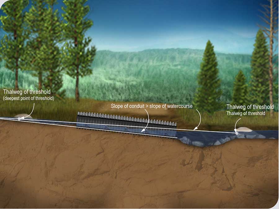 In more uncertain situations, it may be advantageous to immediately select a type of culvert that will comply with the Regulation regardless of the slope of the watercourse and the length of the structure (wood culvert, arch culvert, bridge, etc.). This is especially important because the substrates of watercourses with a steep slope are generally coarser, which can lead to excavation difficulties and even compromise the proper burial of a conduit with outlets, which is an essential condition to ensure the free flow of fish. Coarse substrates may, however, be an advantage to the stability of other types of structure.