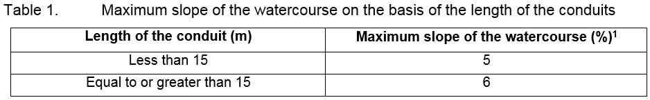Conduits with outlets must be installed in watercourses whose slope is greater than 2%. In addition, the slope of the watercourse may not exceed the percentage appearing in table 1, which varies on the basis of the length of the conduits.