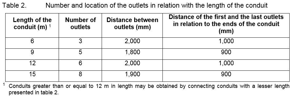 The outlets must not be inclined by more than 9 degrees in relation with the transverse axis of the conduit. The joints between the outlets and the conduit must be leakproof. The number of outlets and their location in the conduits must comply with the standards in table 2, which vary according to the length of the conduit.