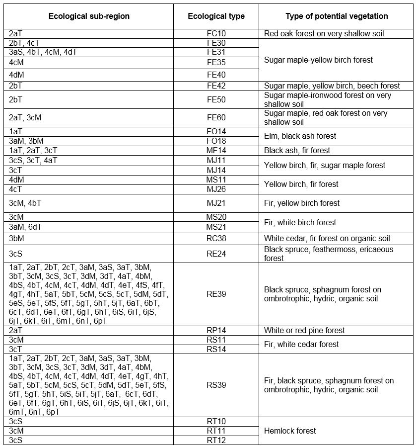 Source: Ouimet, R, et L. Duchesne. 2009. Évaluation des types écologiques forestiers sensibles à l’appauvrissement des sols en minéraux par la récolte de biomasse. MRNF, Direction de la recherche forestière. Rapport hors série. 26 p.