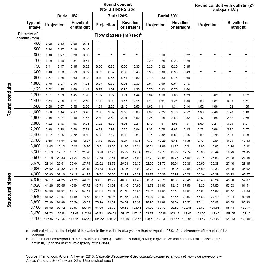 GUIDE TO THE APPLICATION OF THE REGULATION RESPECTING THE SUSTAINABLE DEVELOPMENT OF FORESTS IN THE DOMAIN OF THE STATE Complete guidePréparation du PDF. SVP patienter. Chapter I Section 1 Section 2 Chapter II Section 3 Section 4 Section 5 Section 6 Section 7 Section 8 Section 9 Section 10 Section 11 Section 12 Section 13 Section 14 Section 15 Section 16 Section 17 Section 18 Section 19 Section 20 Section 21 Section 22 Section 23 Section 24 Chapter III Section 25 Section 26 Section 27 Section 28 Section 29 Section 30 Section 31 Section 32 Section 33 Section 34 Section 35 Section 36 Section 37 Section 38 Section 39 Section 40 Section 41 Section 42 Section 43 Section 44 Section 45 Section 46 Chapter IV Section 47 Section 48 Section 49 Section 50 Section 51 Section 52 Section 53 Section 54 Section 55 Section 56 Section 57 Section 58 Section 59 Section 60 Section 61 Chapter V Section 62 Section 63 Section 64 Section 65 Section 66 Section 67 Section 68 Section 69 Section 70 Section 71 Section 72 Section 73 Section 74 Section 75 Section 76 Section 77 Section 78 Section 79 Section 80 Section 81 Section 82 Section 83 Section 84 Section 85 Section 86 Section 87 Section 88 Section 89 Section 90 Section 91 Section 92 Section 93 Section 94 Section 95 Section 96 Section 97 Section 98 Section 99 Section 100 Section 101 Section 102 Section 103 Section 104 Section 105 Section 106 Section 107 Section 108 Section 109 Section 110 Section 111 Section 112 Section 113 Section 114 Section 115 Section 116 Section 117 Section 118 Section 119 Section 120 Section 121 Section 122 Section 123 Section 124 Section 125 Section 126 Section 127 Section 128 Section 129 Section 130 Chapter VI Section 131 Section 132 Section 133 Section 134 Section 135 Section 136 Section 137 Section 138 Section 139 Section 140 Section 141 Section 142 Section 143 Section 144 Section 145 Section 146 Chapter VII Section 147 Section 148 Section 149 Section 150 Section 151 Section 152 Section 153 Section 154 Section 155 Chapter VIII Section 156 Section 157 Section 158 Section 159 Section 160 Chapter IX Section 161 Section 162 Section 163 Section 164 Section 165 Section 166 Section 167 Schedules Schedule 1 Schedule 2 Schedule 3 Schedule 4 Schedule 5 Schedule 6 Schedule 7 Schedule 8 Schedule 9 Schedule 10 Schedule 11 Schedule 12 Schedule 13 ‹ PreviousNext › Schedule 8 Diameter required for round conduits according to the peak flowa (Q10 Q1,20), the type of intake and the burial 1 Additional information The decision tree below can be used to decide on the type of structure that must be installed to cross a watercourse.