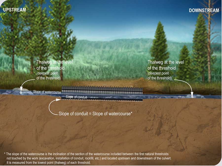 1 The slope is the inclination of the section of the watercourse included between the first natural thresholds not touched by the work (excavation, installation of conduit, rockfill, etc.) and located upstream and downstream of the culvert. It is measured from the thalweg of each threshold. ![]()