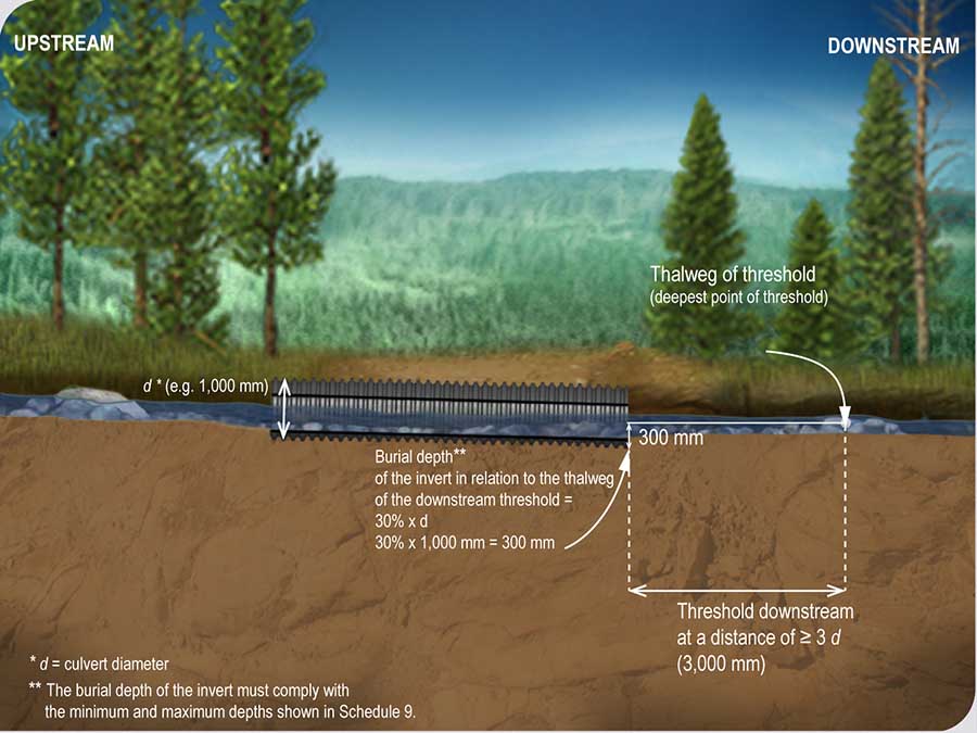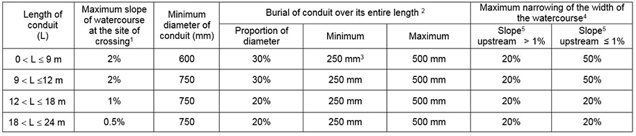 All the conditions (width, slope, burial, narrowing, etc.) indicated in Schedule 9 must be complied with when installing a culvert with a circular conduit in a watercourse where the free circulation of fish must be ensured. If it is not possible to comply with a given condition (e.g. if it is difficult to comply with burial conditions due to the presence of rock), another type of structure (arch, bridge, etc.) must be installed instead.