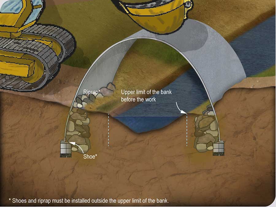 On crossing sites where the free flow of fish must be ensured, the depth at which the circular conduit of the culvert must be buried is calculated using a variety of parameters such as the slope of the watercourse, the length of the conduit, the diameter of the conduit, and so on. The burial depth must be 20% or 30% of the diameter of the conduit and must meet the maximum and minimum specifications set out in Schedule 9.